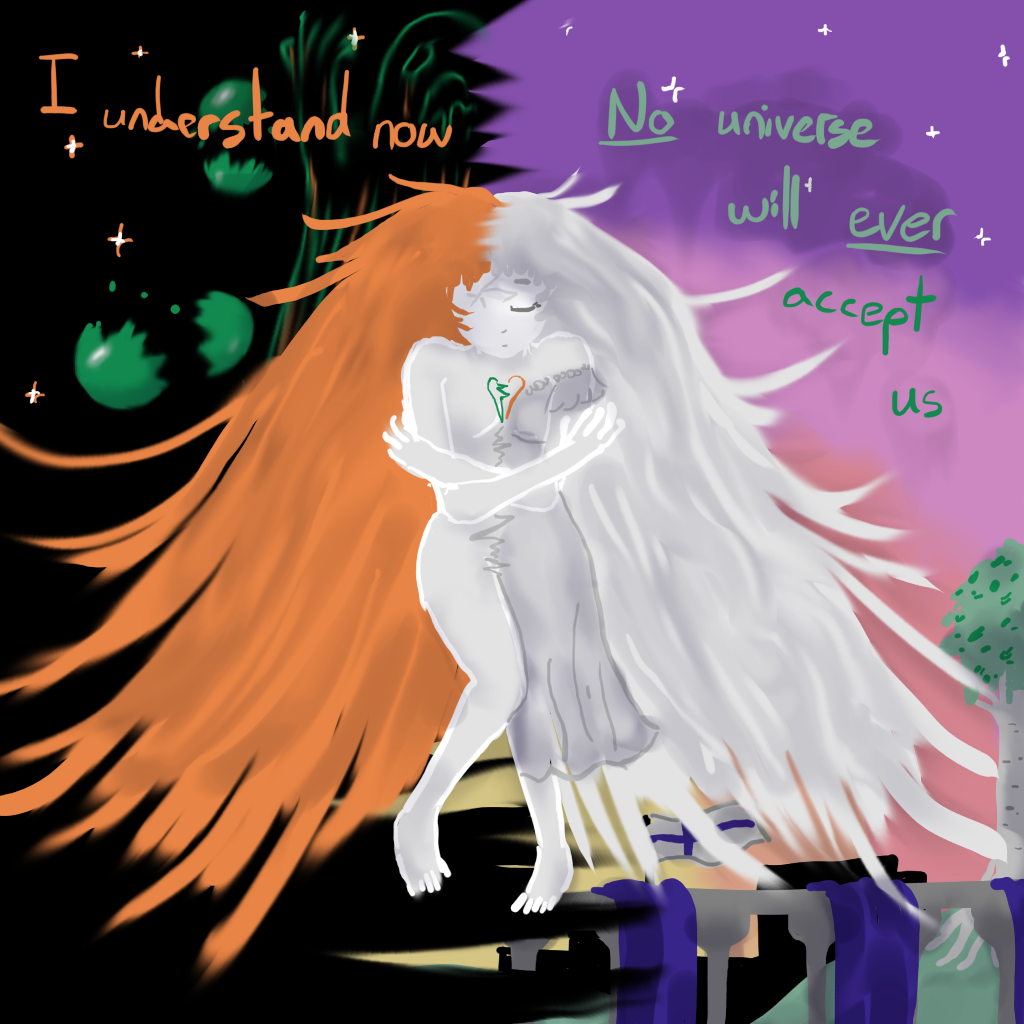 This fanart shows Princess Lily from Void Stranger the morning after Lord Johann has sexually assaulted her. The piece is set moments before Lady Gray finds her standing on the balcony railing and rescues her from suicide. Lily's appearance in the left half of the image references Despair, the antagonist from ZeroRanger, from whom Lily is strongly implied to be reincarnated. In ZeroRanger, the final words of Erasure, Despair's sister, are "Do you think this future—your future—if we were to be born again in it—would it accept us?" The implication of the fanart's caption is that Lily is experiencing memories resurfacing from her past life and has chosen to understand Johann's assault as a rejection of her existence.