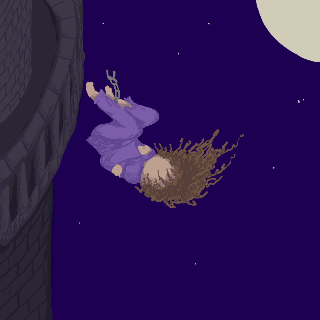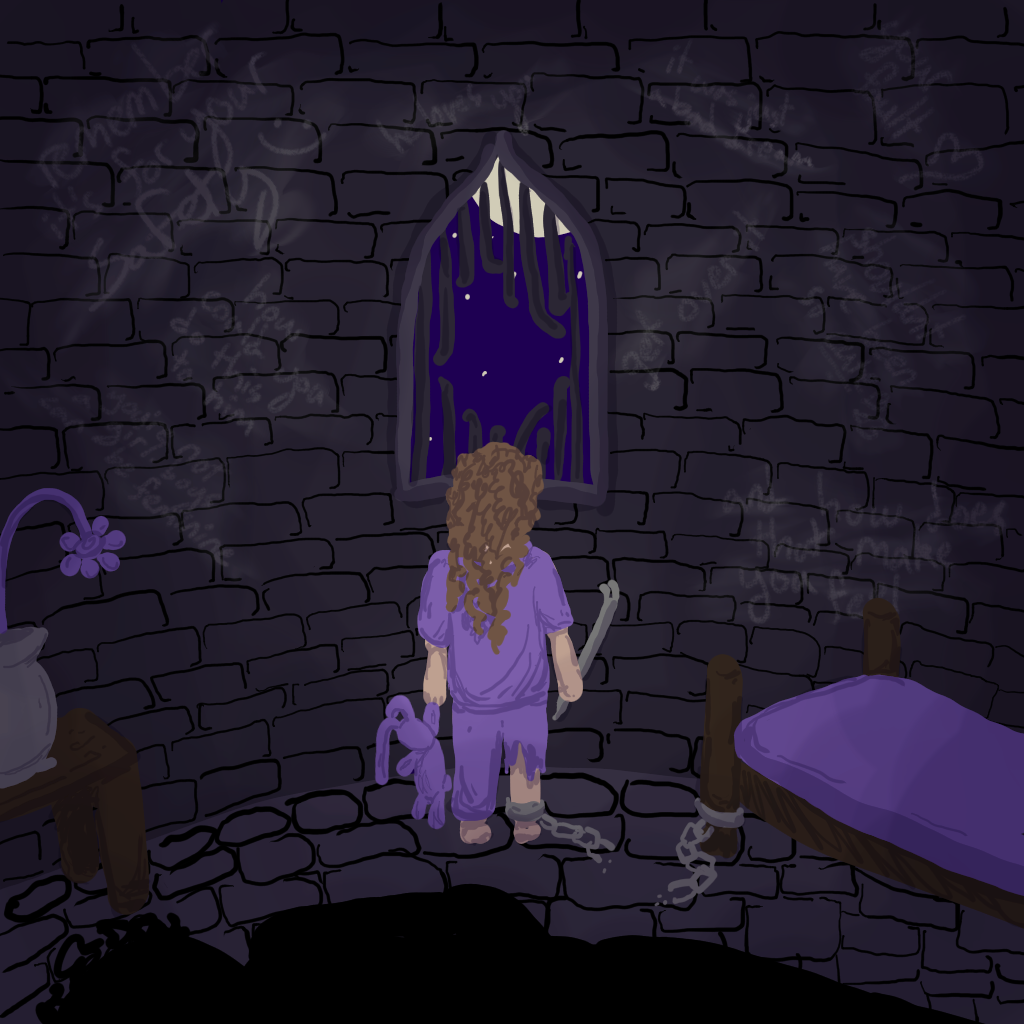 I drew this shortly before Singer's secondary fracture. I believe it was a warning sign that it was going to happen. The girl in this picture is Singer. The silhouette is Bernard. The purple rabbit is Lorna. The tower serving as the drawing's setting is me. I feel Singer was trapped in this tower for most of our life, and the catalyst for her secondary fracture was her escape.