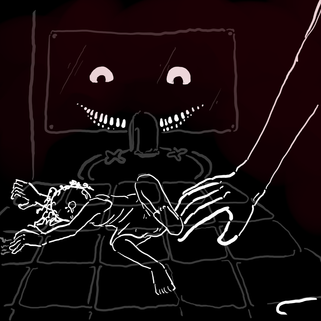 This drawing illustrates one of Lucy's recurring nightmares. We believe it corresponds to the incident we tried to report to our mother, in which our father woke us up to bring us to the bathroom and penetrate us on the counter.