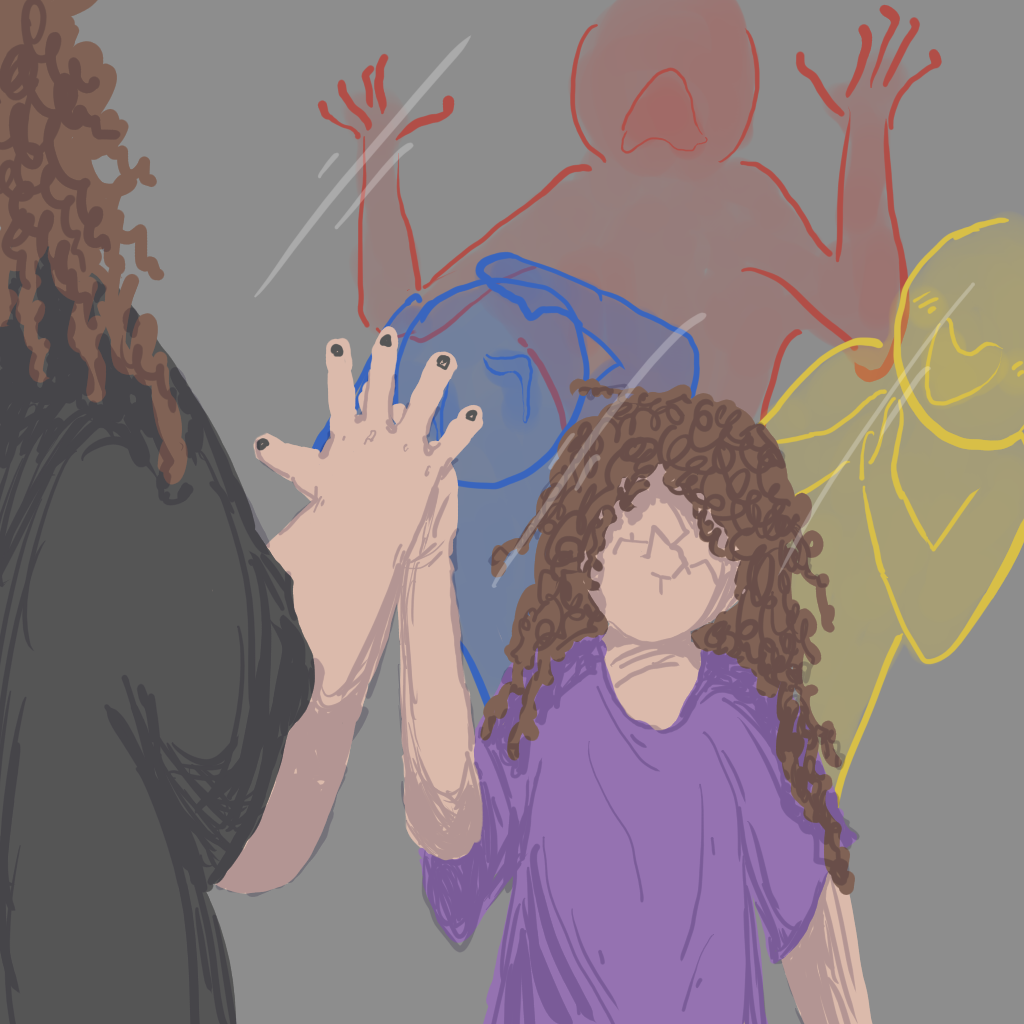I drew this shortly after Singer's secondary fracture. It illustrates the moment I realized the fracture had occurred. The large adult reaching toward the mirror is me. Reflected in the mirror, the young girl in purple is Singer; the red ghost is Lucy; the blue ghost is Alice; and the yellow ghost is Daisy.